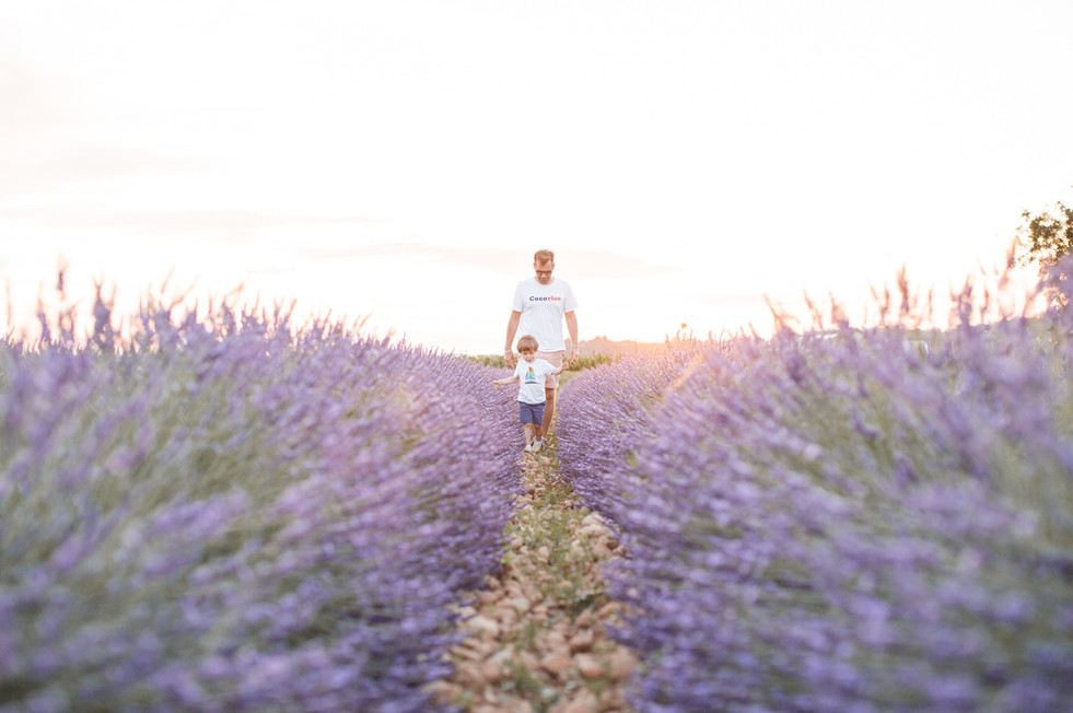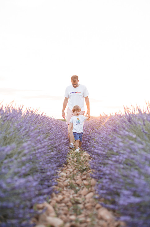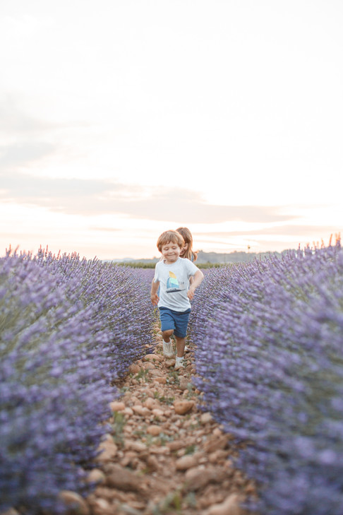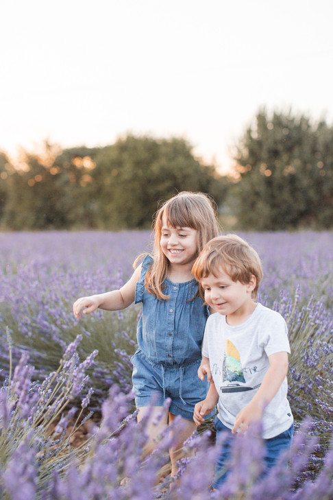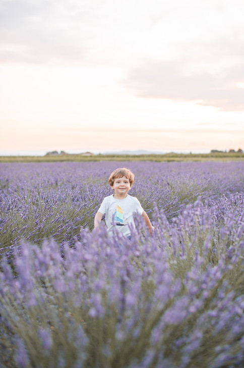 En plus, pour cette séance, nous avons choisi l'heure dorée (golden hour 😊) pour réaliser nos photos! Et je dois dire qu'entre le ciel rosé et les lavandes dans des tons de violet, nous avons ainsi un joli camaïeu de couleurs sur les photos! Et puis, les enfants étaient ravis (enfin un soir où papa et maman ne nous demandent pas de nous coucher à 21h 😉) et nous aussi, car ça nous a permis d'aller nous promener en soirée, de profiter de la douceur de l'été et des beaux paysages drômois! C'était un bon moment en famille, dans un cadre parfait et avec une luminosité exquise!